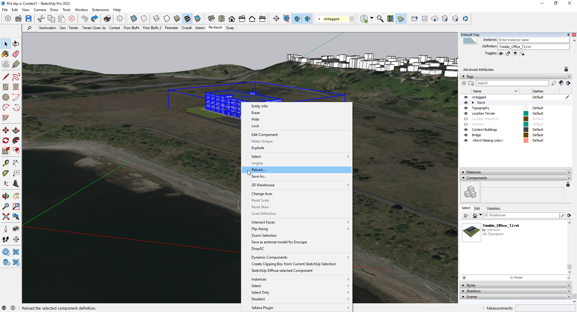 Import the file into SketchUp. You should see the phase you just saved in Revit, turned into one big component.Pro tip: You may need to hide certain tags or geometry in your SketchUp model to see what you just imported if there’s overlap between that phase and anything else you’ve already transferred into SketchUp. The importer defaults to the same origin point each time, so as long as you didn’t move things in either model, the phase you just imported will align perfectly with other parts of your SketchUp model. It may just be hidden under other geometry.