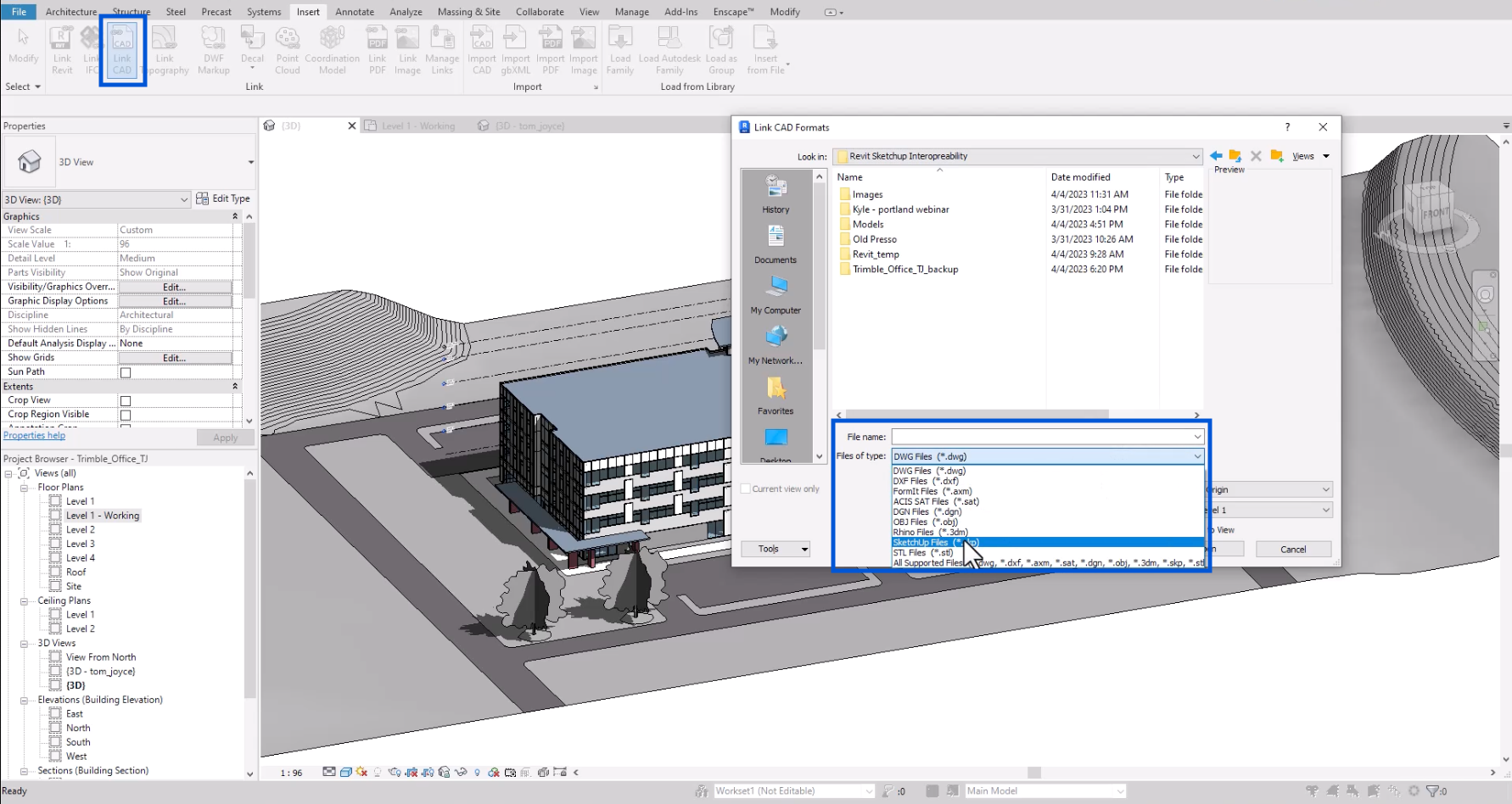 After making design decisions based on your SketchUp model, you likely want to go back to Revit to update a construction documentation (CD) set or finalize permit documentation. People often don’t realize you can bring SketchUp files directly into Revit by linking or importing them. From the “Insert” tab, use the “Link CAD” or “Import CAD” functions. It’s worth noting that you’ll need to have the file type in the dialog set to SketchUp files. The default is CAD file types, so you may not initially see your SketchUp file as an option.